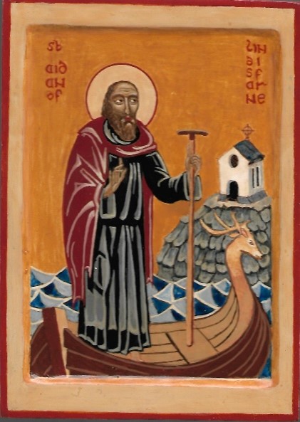 St Aidan of Lindisfarne, called by King Oswald to evangelise from Iona his kingdom and set up his monastery at Lindisfarne, shown in the icon, where later the Lindisfarne Gospels would be created. In the icon the tau-cross doubles as a mast for the boat. The stag’s head prow recalls Aidan’s request to build a monastery between the antlers of a stag he could see from Bamburgh, the royal Palace. His gaze fell on Lindisfarne. The boat itself recalls the Ark, a perpetual symbol of salvation. He was known for his humility and concern for the poor. He died in Bamburgh church in 651