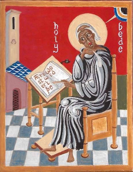 Venerable Bede, 673-735, first translator of the gospels into English. He is portrayed deep in thought as writes the opening line of St John’s Gospel in (Old) English, having already written The Ecclesiastical History of the English People, and many other theological and scientific works. The composition is partly inspired by Fenwick Lawson’s sculpture of Bede. He became renowned as a scholar throughout mediaeval Europe